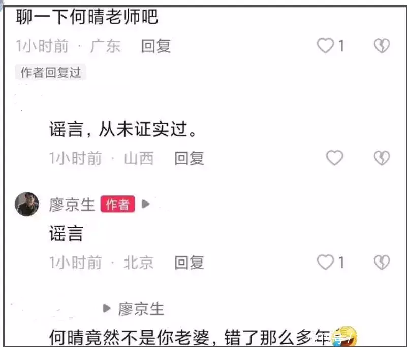 12月8日,何晴超话主持人专门发布了一条动态,强调何晴早已亲自辟谣,廖京生只是合作过的优秀演员,网络传闻均不实,请停止传播无聊信息。